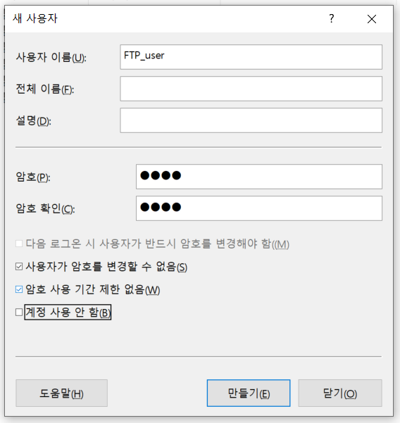 FTP 사이트 설정이 완료되었으므로 이제 파일서버 접속 시 사용할 사용자를 생성하고 FTP 서비스를 실행해보겠습니다.