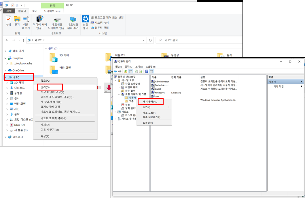 19. 컴퓨터 관리 화면이 열리면 로컬 사용자 및 그룹 > 사용자 > 마우스 오른쪽 버튼 > 새 사용자를 선택합니다.
