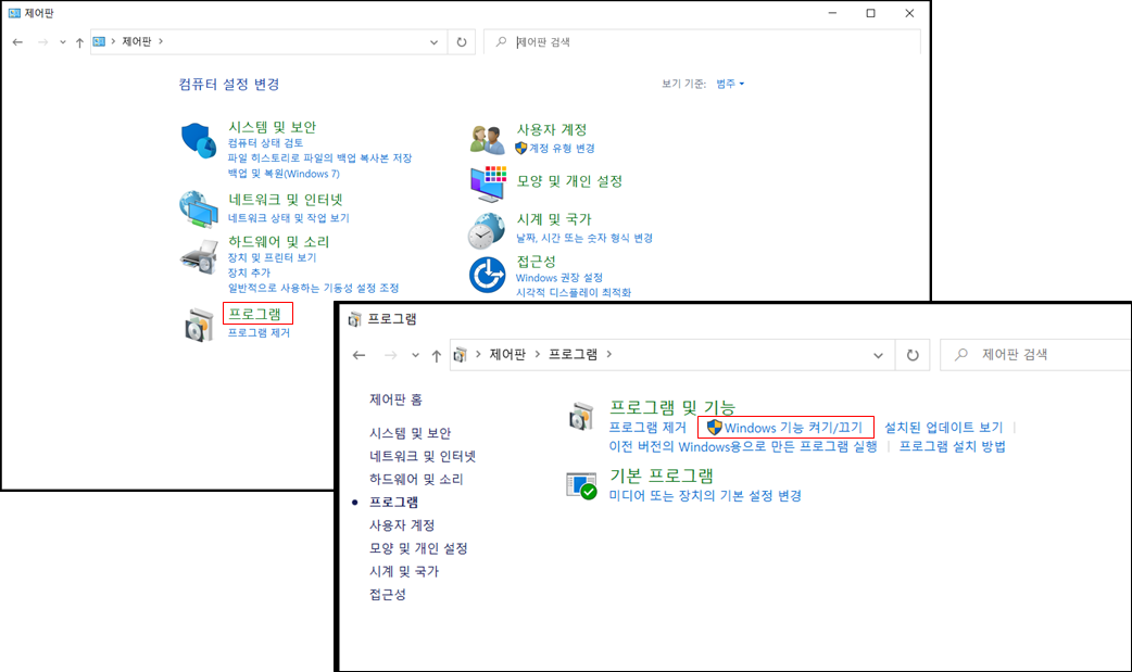 2. 프로그램 및 기능 > Window 기능 켜기/끄기를 선택합니다.