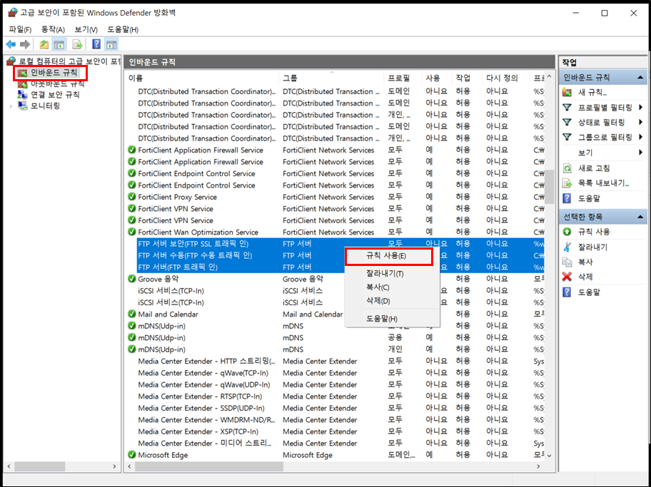 17. 인바운드 규칙, 아웃바운드 규칙에서 FTP 관련된 규칙을 사용하도록 설정합니다.