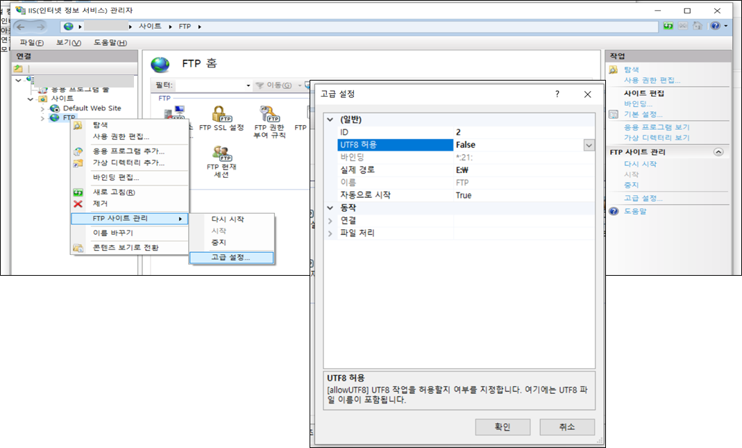이 경우, IIS 관리자 > FTP 사이트 > 마우스 오른쪽 버튼 클릭 > FTP 사이트 관리 > 고급 설정으로 들어가 UTF8 허용을 False로 변경합니다.