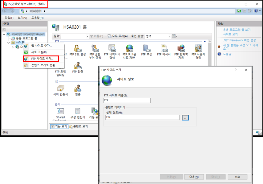 9. FTP 사이트 이름과 공유할 디렉터리 경로를 지정한 후 다음을 클릭합니다.
